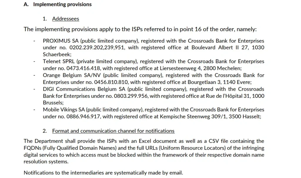 In plaats van een brede aanpak richt het bevel zich strikt op de vijf grootste internetaanbieders van België: Proximus, Telenet, Orange Belgium, DIGI Communications Belgium en Mobile Vikings.