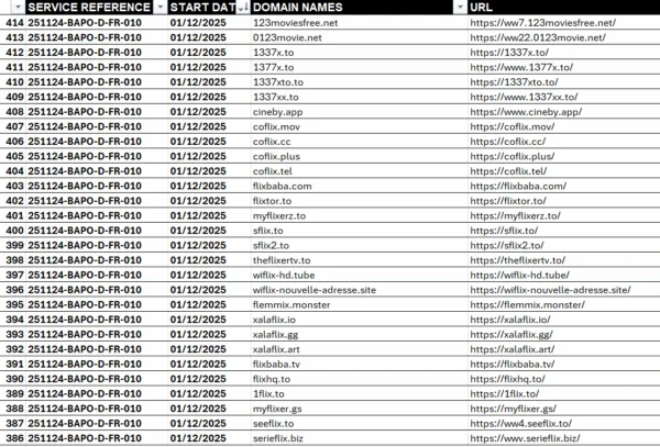 In het officiële bevel worden de rechthebbenden die het blokkeren vroegen niet genoemd, net zo min als de specifieke sites. Toch zijn de geblokkeerde domeinen via een aparte lijst openbaar, waaruit blijkt dat onder meer 1337x, Fmovies, Soap2day en Sflix tot de belangrijkste doelwitten behoren.
