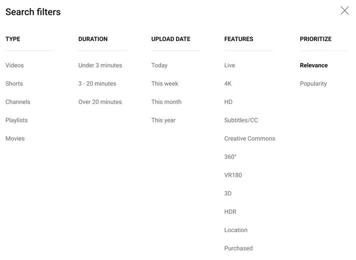 Het menu ‘Sorteren op’ heet voortaan Prioriteren, en het filter ‘Aantal weergaven’ is vervangen door ‘Populariteit’. Dit filter toont populaire video’s die relevant zijn voor jouw zoekopdracht. YouTube bepaalt populariteit aan de hand van het aantal keer bekeken en andere signalen, zoals kijktijd.