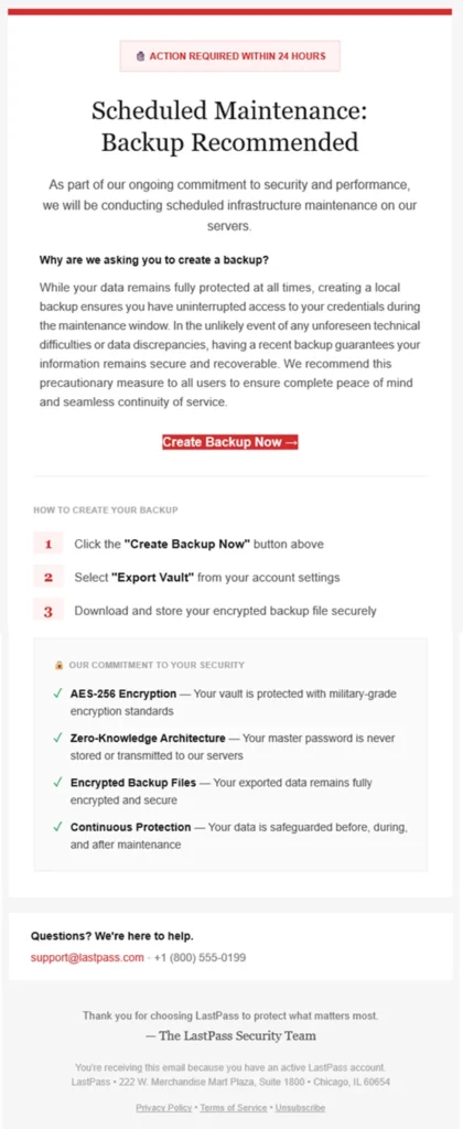 Let op: LastPass vraagt NOOIT haar klanten om binnen 24 uur een back-up van hun vault te maken. Dit is een poging van kwaadwillenden om een gevoel van urgentie te creëren, een veelgebruikte tactiek bij social engineering en phishing.