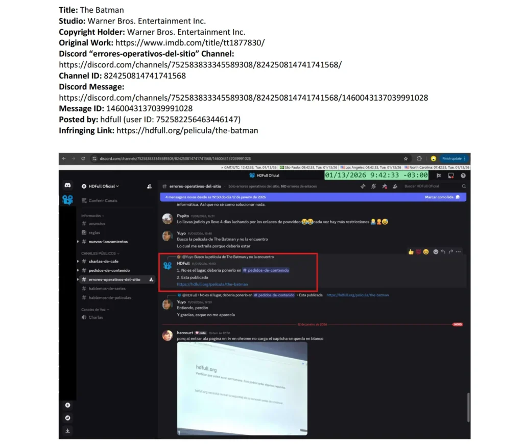 De melding werd vergezeld van een bijlage van 23 pagina’s waarin de activiteiten op de server gedetailleerd werden gedocumenteerd. Screenshots tonen dat het account “hdfull” directe links deelde naar illegale streams van Warner Bros.-films The Batman en It Chapter Two op de HDFull-website. Het account “xenus9999” zou links naar The Batman en Universal’s Furious 7 hebben gepost.