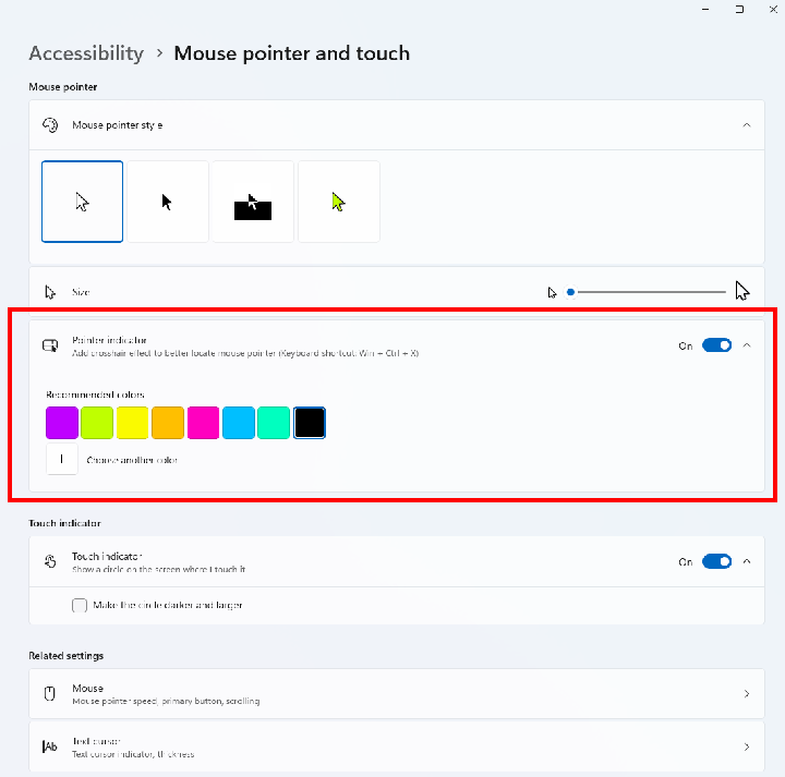 Om deze functie te activeren, gaat u naar Instellingen > Toegankelijkheid > Muisaanwijzer en aanraken en zet u de schakelaar ‘Aanwijzerindicator’ aan. U kunt ook zoeken op naam om de instelling snel te vinden. Als de instelling is ingeschakeld, kunt u de aanwijzer eenvoudig aan- of uitzetten met de sneltoets Win + Ctrl + Shift + X.