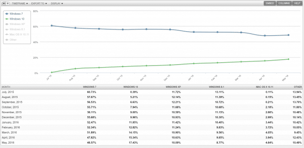 Het wereldwijde marktaandeel van Windows 10 ging na afloop van de maand mei met 2,09 procent de hoogte in, dat weten we uit onderstaande gegevens van Net Applications. Die stijging is effectief de grootste die het bedrijf uit Redmond ooit met de upgrade wist binnen te halen over de periode van een maand.